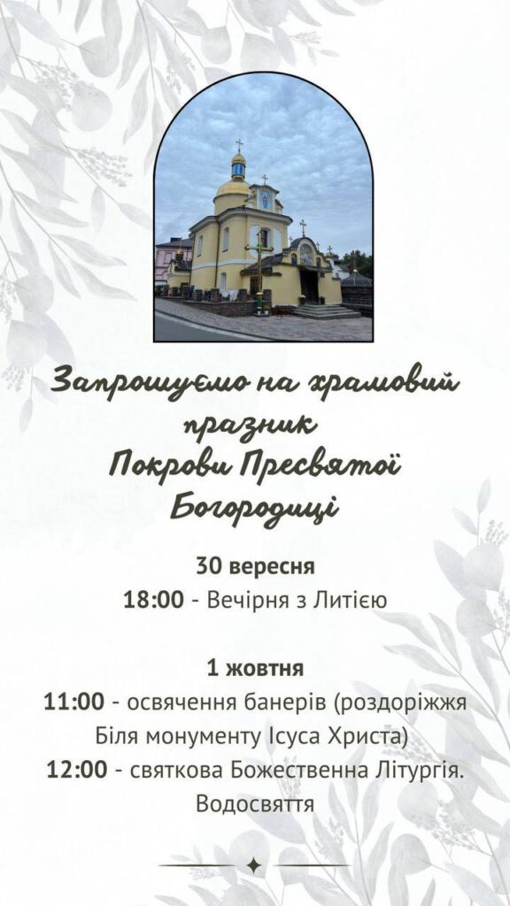 Церква Покрови Пресвятої Богородиці м.Бучач запрошує на Храмовий Празник 01.10.2025 року.