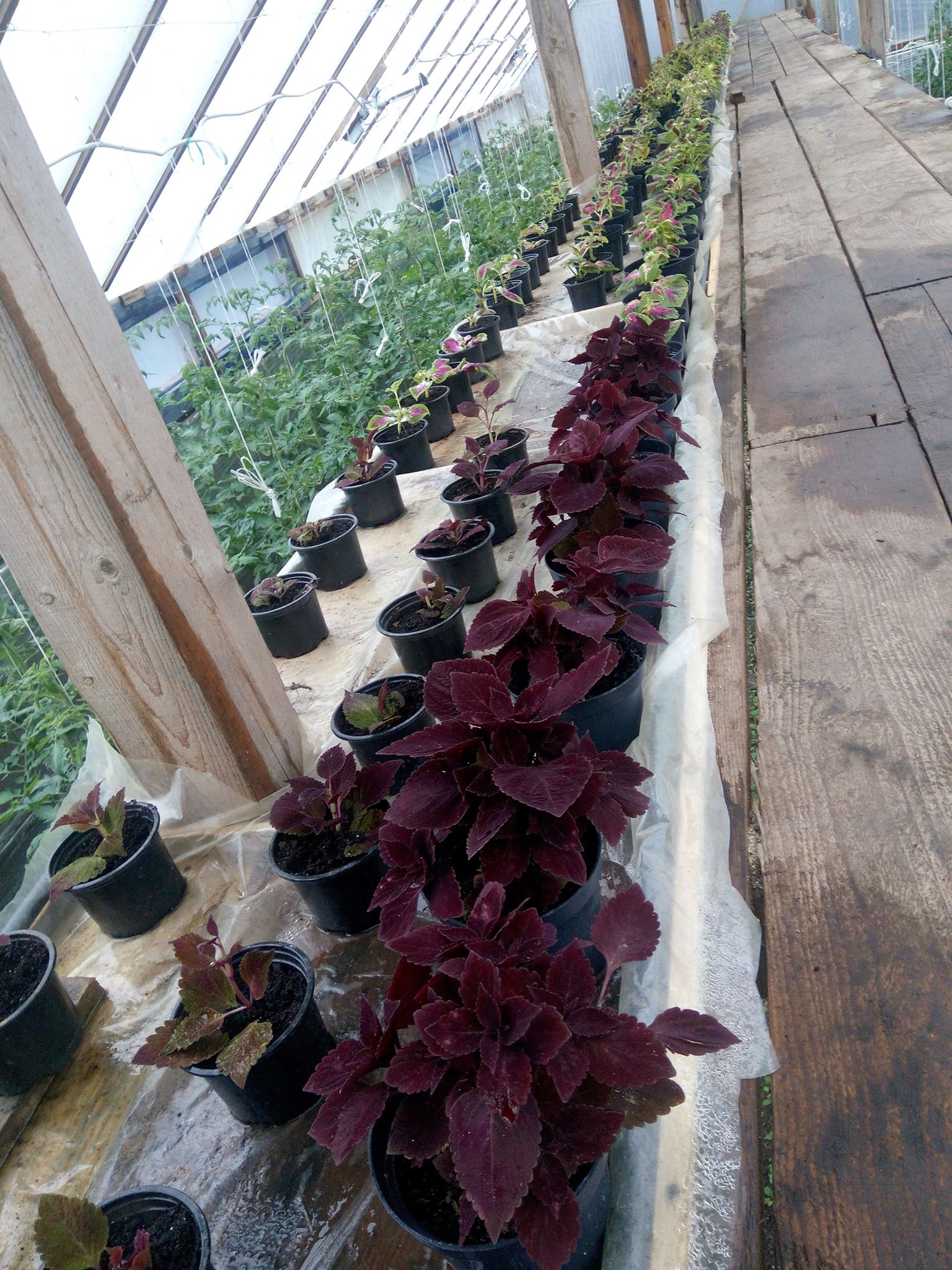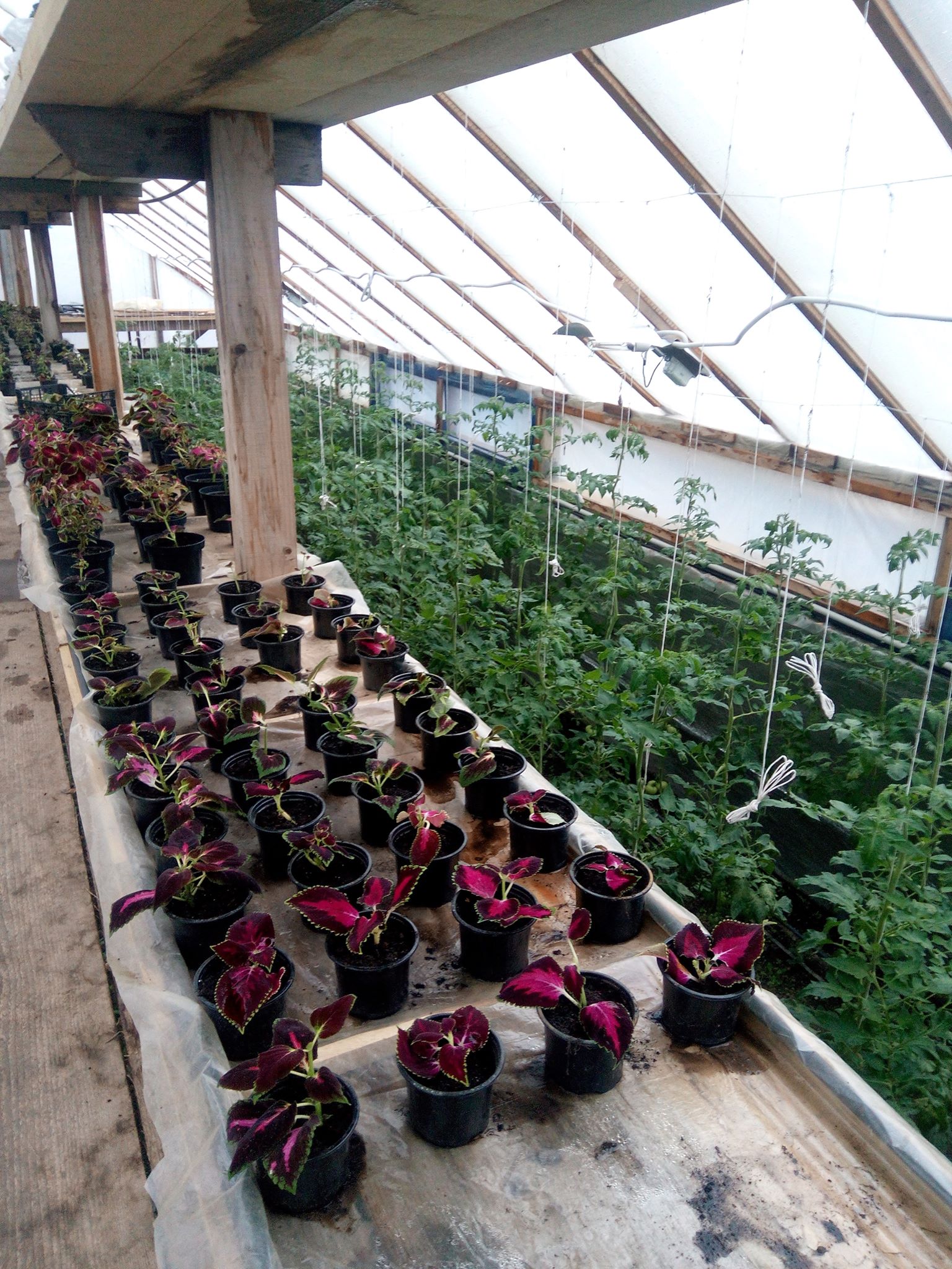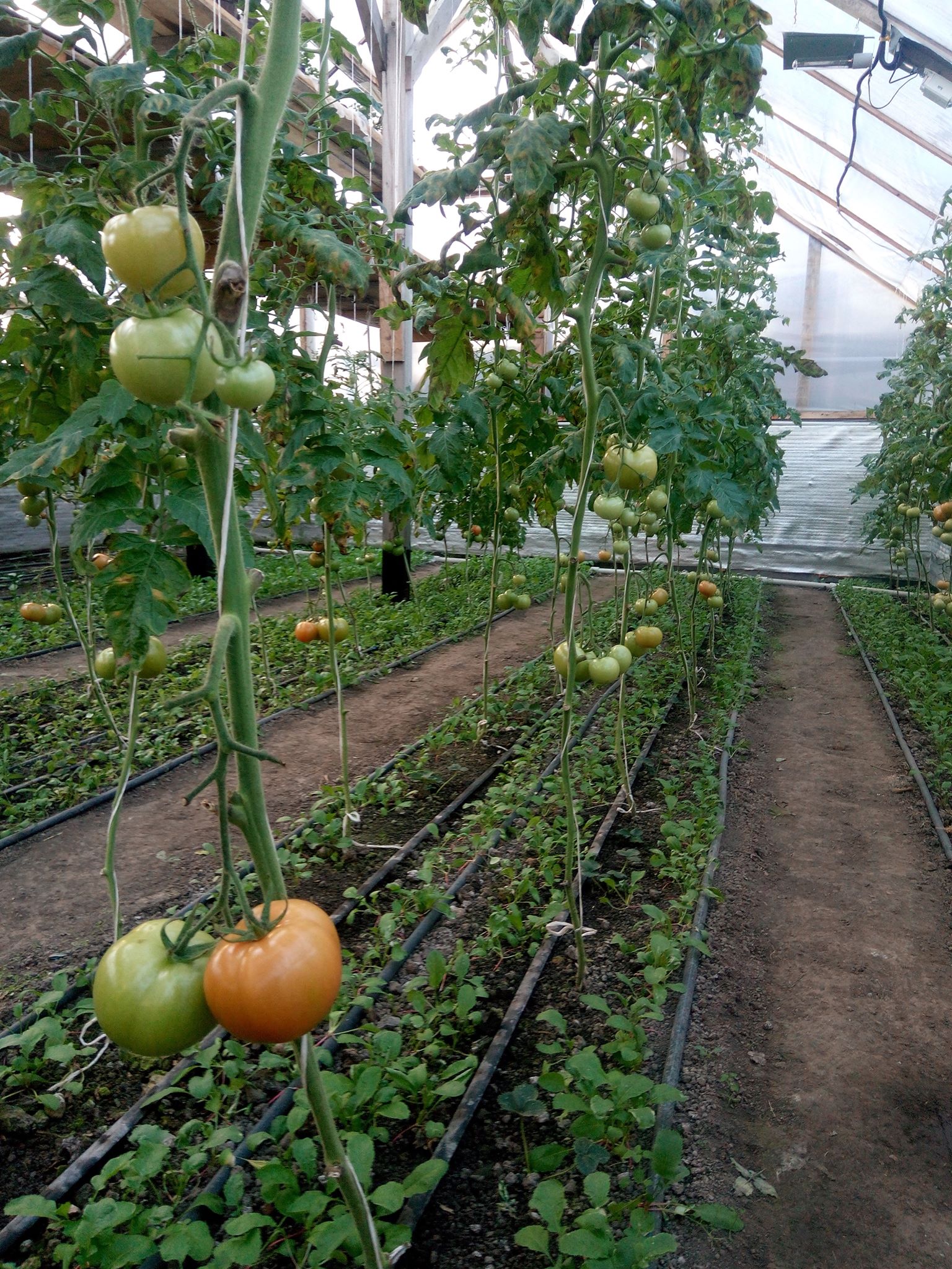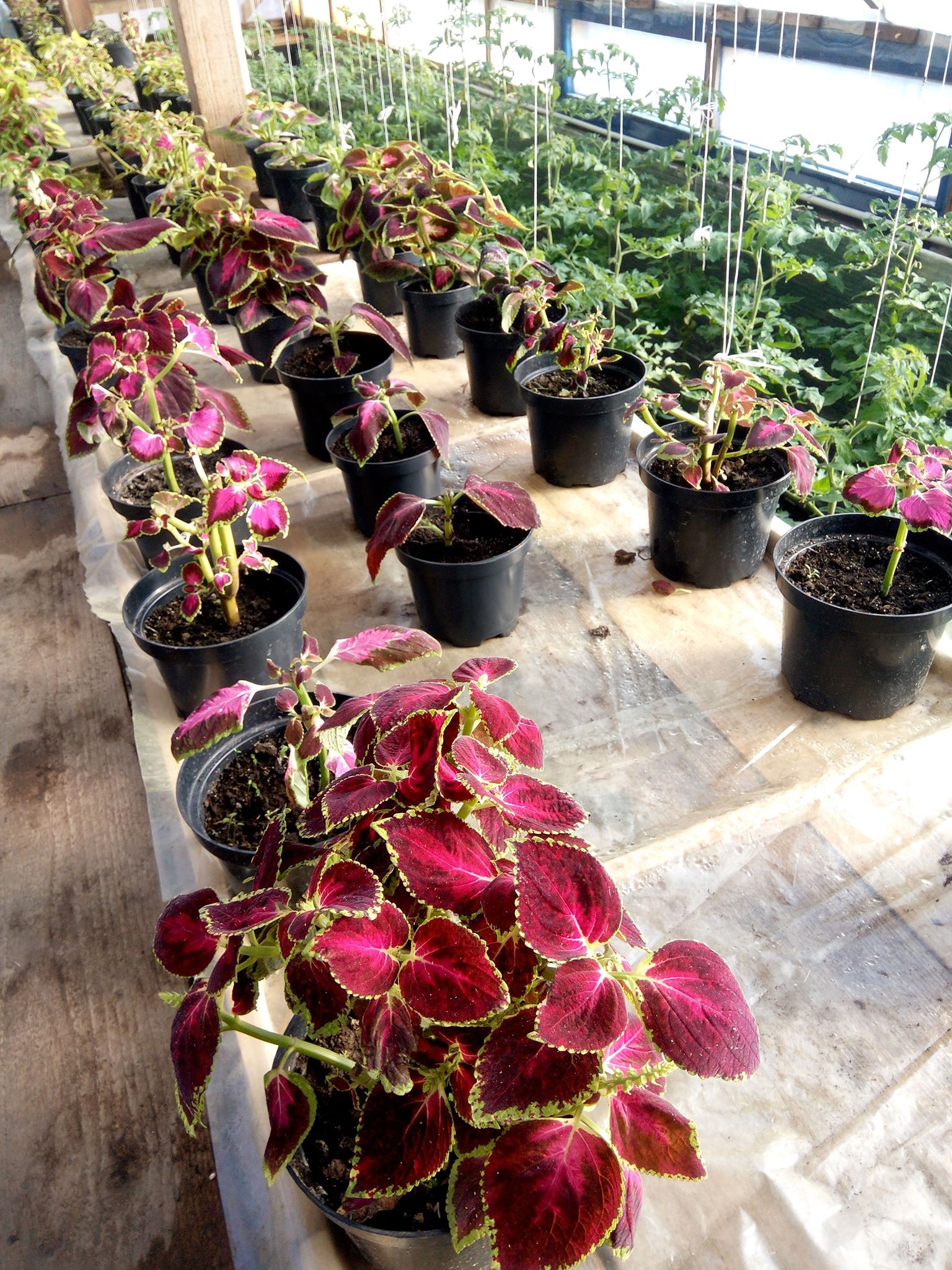 Заходимо всередину теплиці і потрапляємо з зими в літо. Надворі всього градус тепла, а всередині +20 і все навколо зеленіє. Довжелезні стовбури помідорів вже майже досягли стелі, а земля між помідорами вкрита зеленою редискою. На стелажах переливаються різнокольоровими барвами вазонки, починають цвісти квіти, де-не-де зацвіла суниця.